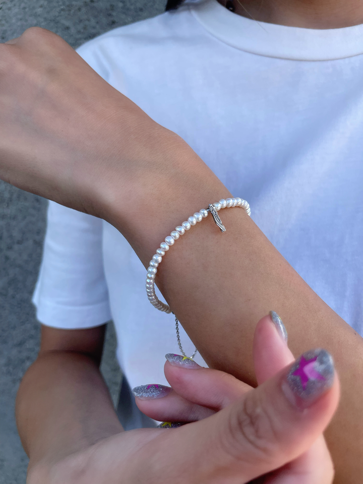 淡水パールの柔らかな光沢と、シルバーの凛とした輝きが、 ユーモラスなモチーフに上品さを添えてくれるブレスレット。 日常のコーディネートに遊び心と華やかさをプラスします。